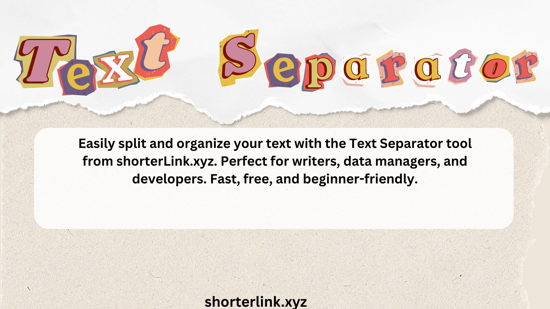 Easily split and organize your text with the Text Separator tool from ShorterLink.xyz. Perfect for writers, data managers, and developers. Fast, free, and beginner-friendly.